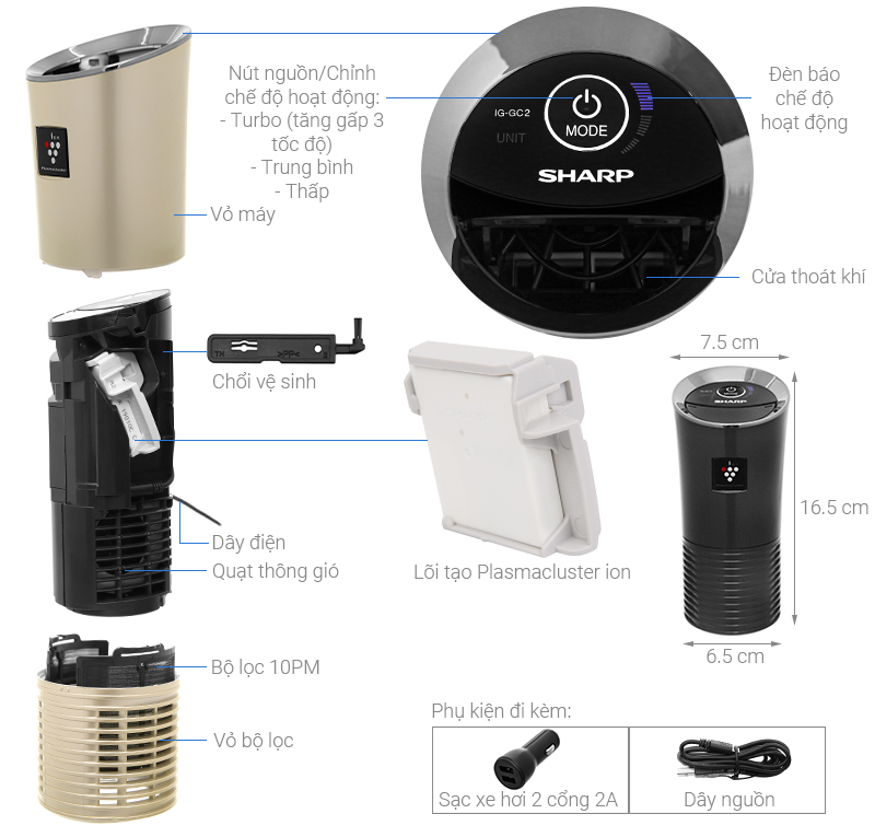 Máy lọc không khí cho xe hơi Sharp IG-GC2E-N có xuất xứ từ Nhật Bản, thiết kế sang trọng, vỏ ngoài giống kim loại, kiểu dáng nhỏ gọn vừa vặn ngăn để ly, không chiếm nhiều diện tích xe.