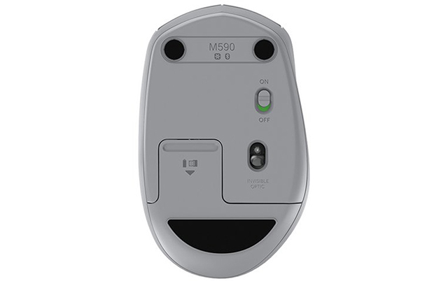 Logitech M590 được trang bị một cần gạt ở ngay sau bề mặt đáy nên chúng có khả năng chuyển đổi một cách rất đơn giản giữa 3 thiết bị nếu được kết nối trong cùng một lúc.