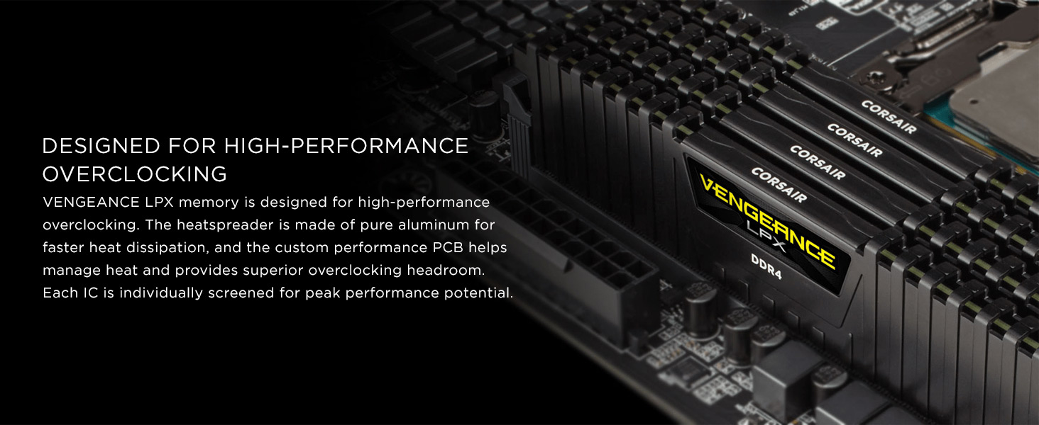 Mỗi module Vengeance LPX được xây dựng từ một PCB tám lớp và IC bộ nhớ cao cấp. Đi kèm tản nhiệt giúp làm mát hiệu quả để cải thiện khả năng ép xung.