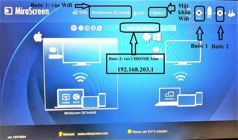 Trên điện thoại vào cài đặt -> wifi setting -> cho điện thoại bắt wifi tên Mirascreen…(Pass wifi là dòng PSK hoặc password trên màn hình giao diện )