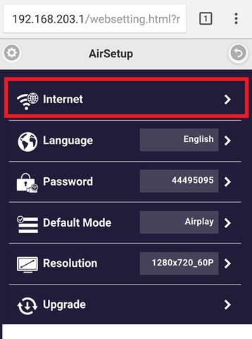 Sau khi kết nối wifi Mirascreen… vào trình duyệt web, gõ lên thanh địa chỉ web: 192.168.203.1 và cho chạy, nó sẽ đưa ta vào giao diện cài đặt của thiết bị Mirascreen.