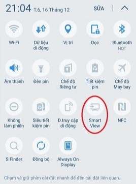 Chế độ này chỉ dùng cho những dòng máy Android cao cấp có tính năng Miracast). Vuốt thanh thông báo xuống nếu có hình “Smart View” hoặc “Miracast” hoặc “Smart Connect” hoặc tương tự, đợi tí là điện thoại kết nối.