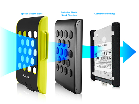 Việc thiết kế ba lớp vỏ bảo vệ của ổ cứng di động ADATA HD720 kết hợp các vật liệu silicone đàn hồi đặc biệt để tạo ra khả năng chống Shock tuyệt với ở mọi góc độ.