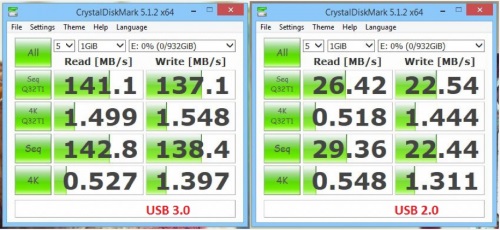 Sử dụng phần mềm Crystal Disk Mark để đánh giá hiệu năng ổ cứng. Ổ cứng cho tốc độ đọc và ghi rất tốt (141 MB/s đọc và 137 MB/s ghi) khi sử dụng với USB 3.0, đây là một con số rất ấn tượng so với các ổ cứng gắn ngoài khác.