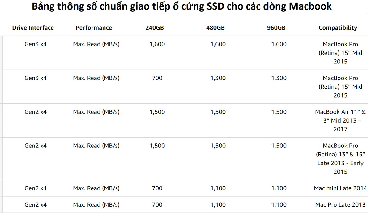 | Macbook Air 11" & 13" | Late 2010 | MacbookAir 3,1 | MC505xx/A MC506xx/A | Chỉ hỗ trợJetDrive 500240GB | |