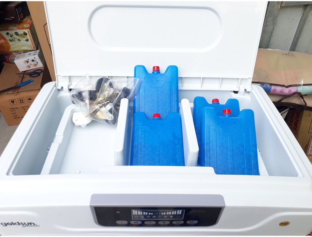 Chân bắt vít, điều khiển từ xa, sách hướng dẫn sử dụng, khay đá khô và phiếu bảo hành sản phẩm.