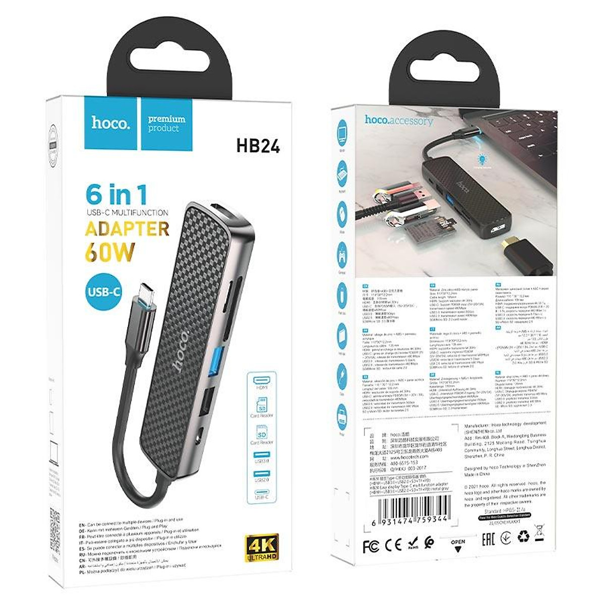 Hub Hoco HB24 được làm từ chất liệu hợp kim kẽm + ABS + bảng acrylic. Hub Hoco Type C chuyển sang HDMI + USB3.0 + USB2.0 + SD + TF + PD có thể tương thích với các hệ điều hành . Hỗ trợ độ phân giải 4K/30Hz. Cổng Type C hỗ trợ truyền dữ liệu . Hỗ trợ tối đa PD 60W . Đầu đọc thẻ SD&TF: 2.0 (không hỗ trợ đọc đồng thời).