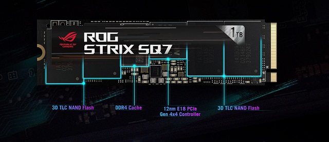 Ổ cứng SSD ASUS ROG STRIX SQ7 PCIe Gen4 x4 NVMe M.2 được sản xuất theo tiến trình 12nm tiên tiến đảm bảo con chip Phison PS5018-E18 được hoạt động tối đa hiệu suất tính toán để xử lý các ECC. Bộ nhớ đệm DDR4 DRAM và giao điện PCie 4.0x4, hỗ trợ giao thức NVMe 1.3, Strix SQ7 được thiết kế để có hiệu suất siêu nhanh, ổn định và tuổi thọ cao hơn.