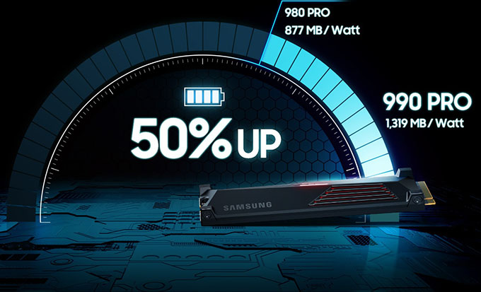 Ổ cứng SSD Samsung 990 PRO Heatsink PCIe NVMe M.2 2280 V-NAND sử dụng ít năng lượng hơn với hiệu suất được cải thiện đến 50% trên mỗi Watt so với 980 PRO. Thiết kế tiêu thụ điện năng thấp này giúp đạt hiệu suất tối đa PCIe ® 4.0 với hiệu suất năng lượng tối ưu nhất.