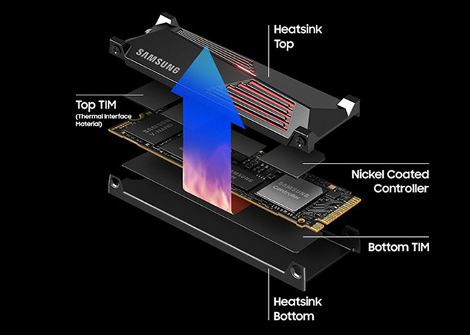 Đối với các dòng SSD có hiệu suất cao thường phải được trang bị tính năng kiểm soát nhiệt độ với độ tin cậy cao. Để đảm bảo hiệu suất ổn định, ổ cứng SSD Samsung 990 PRO Heatsink PCIe NVMe M.2 2280 V-NAND được phủ lớp bọc Niken và sử dụng thuật toán điều khiển nhiệt cho hiệu suất ổn định để khả năng giải nhiệt hiệu quả hơn cho các chip NAND.