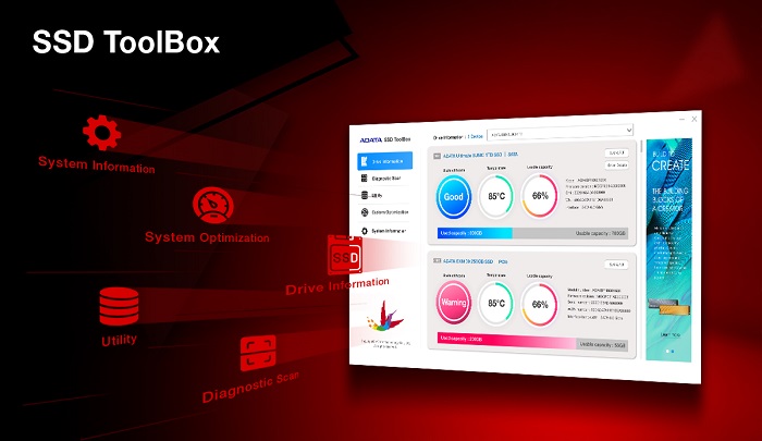 SSD ToolBox tự động cập nhật giúp bạn sở hữu firmware phiên bản mới nhất để tối ưu hiệu suất đồng thời hỗ trợ kiểm soát trạng thái và tuổi thọ còn lại của các ổ sao lưu thông qua công nghệ Tự kiểm soát, Phân tích và Báo cáo (S.M.A.R.T.). Ngoài ra, sản phẩm còn giúp bạn quản lý nhiệt độ vận hành, dung lượng hoạt động và tổng dung lượng đã sử dụng.