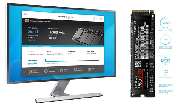 Ổ cứng SSD Samsung 960 PRO NVMe M.2 PCIe đi kèm phần mềm Samsung Magician, cho phép bạn dễ dàng theo dõi, quản lý và duy trì hiệu suất SSD của bạn. Magician sẽ giúp đảm bảo rằng các firmware SSD vẫn được cập nhật và cung cấp một loạt các chức năng bổ sung cho phép bạn điều chỉnh các thiết lập cho phù hợp nhất sử dụng của bạn. Kèm theo phần mền chuyển hệ điều hành Samsung Data Migration có thể tải miễn phí trên trang chủ Samsung giúp bạn lắp đặt và chuyển dữ liệu dễ dàng.