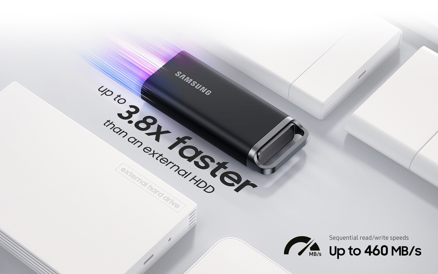 Với tốc độ đọc/ghi tuần tự lên đến 460 MB/s, Ổ cứng di động SSD T5 EVO có khả năng xử lý tác vụ chuyển đổi tệp lớn với hiệu suất nhanh và ổn định hơn so với ổ cứng ngoài khác.