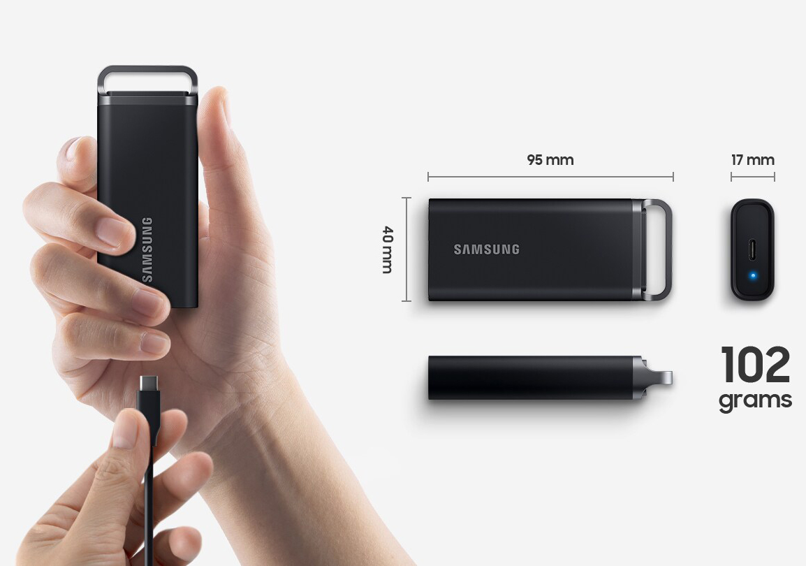 Kích thước nhỏ gọn, thân máy nhẹ đạt tiêu chuẩn trên Ổ cứng di động SSD Samsung T5 EVO - chỉ nặng 102 gram và thiết kế bề mặt có vân chống trượt để mang đến cho bạn cảm giác cầm nắm thoải mái, an toàn trong lòng bàn tay.