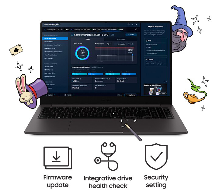 Ổ cứng di động Portable SSD Samsung T9 được tích hợp phần mềm nâng cấp cho PC và Mac để giúp bạn thiết lập mật khẩu và dấu vân tay và nhận các bản cập nhật firmware mới nhất. Bạn cũng có thể tải xuống ứng dụng di động cho điện thoại thông minh và máy tính bảng.