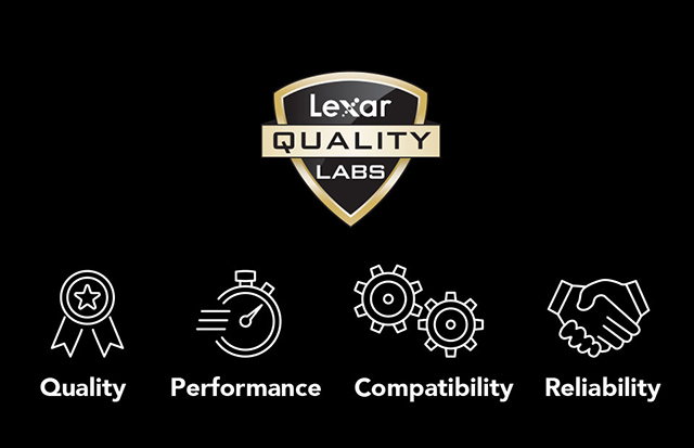 Tất cả các thiết kế sản phẩm Lexar trải qua thử nghiệm rộng rãi trong Lexar Quality Labs, với hơn 1.100 thiết bị kỹ thuật số, để đảm bảo hiệu suất, chất lượng, khả năng tương thích và độ tin cậy.